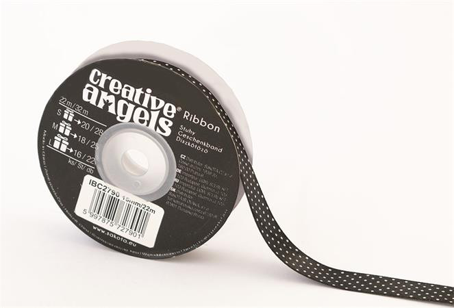 Szatén szalag, 15 mm x 22 m, fekete fehér pötyökkel - /db (22 méter)