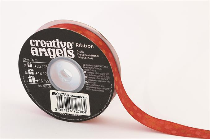 Szatén szalag, 15 mm x 22 m, piros vegyes pötyökkel - /db (22 méter)