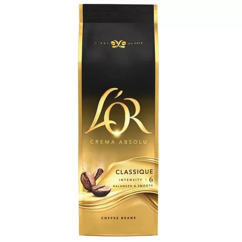 L'OR Crema Absolu Classique ist eine 500-g-Packung mit ganzen Kaffeebohnen, die sich durch einen vollmundigen Geschmack und ein raffiniertes Aroma auszeichnet.