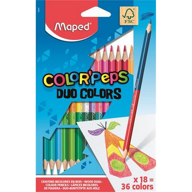 Színes ceruza készlet, háromszögletű, kétvégű, MAPED "Color`Peps Duo", 36 különböző szín. - /készlet (18 db)