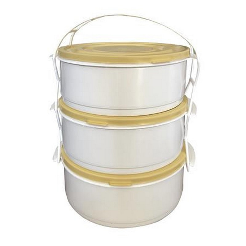 Háromrészes, műanyag étlehordó, különféle színes tetőkkel, praktikus fogófüllel, ami a három részt szállítás, emelés közben összetartja.