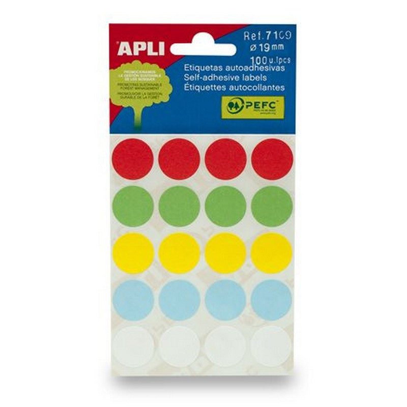 Etikett, 19 mm kör, kézzel írható, színes, APLI, vegyes színek, 100 etikett/csomag. - /csom (5 lap)
