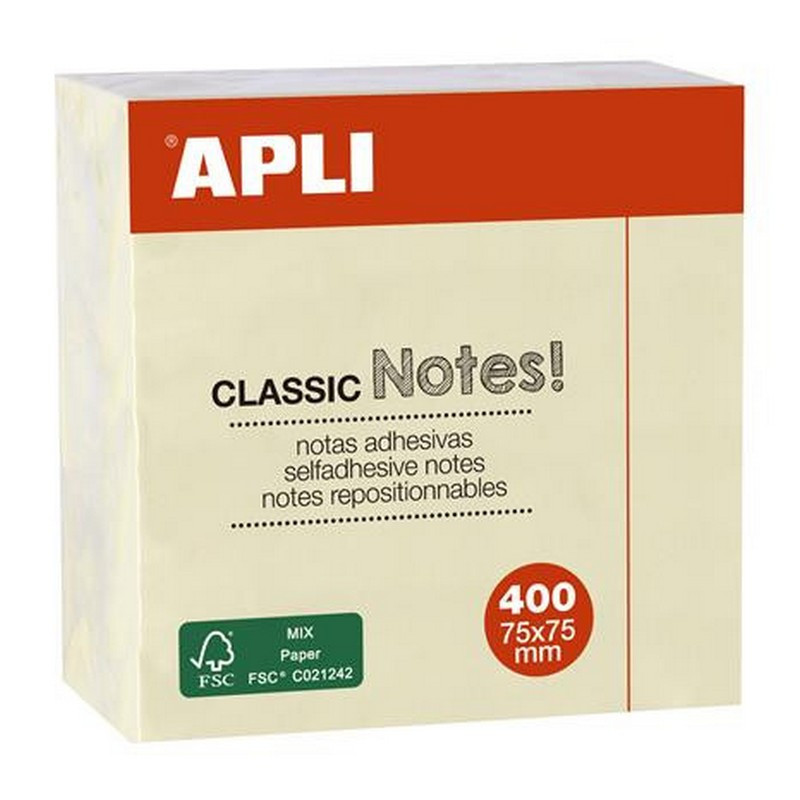 Öntapadó jegyzettömb, 75x75 mm, 400 lap, APLI "Classic", sárga. - /csom (400 lap)