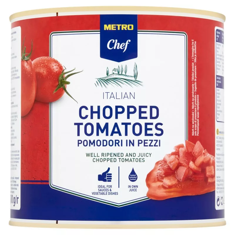 A METRO Chef Chopped Tomatoes egy 2,55 kg-os konzerv finomra vágott friss paradicsomból, paradicsomlébe áztatva. Ezek a paradicsomok jól érett és lédús olasz paradicsomból készülnek, amely csúcsízt kölcsönöz, így ideális szószokhoz és zöldséges ételekhez. Felbontás után helyezze át a tartalmát egy megfelelő tárolóedénybe, tárolja hűtőszekrényben, és 3 napon belül használja fel.