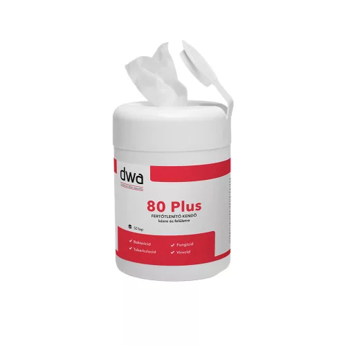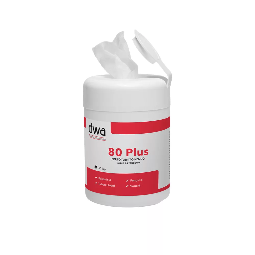 DWA 80 Plus kéz- és felületfertőtlenítő törlőkendő dobozos 50 lap BIOCID hatóanyag: etanol: 83,5% bifenil-2-ol:0,15% Antimikrobiális hatásspektrum: baktericid (MRSA), fungicid, virucid (HBV, HIV inaktiváló hatású), tuberkulocid Alkalmazási terület: Bőr és kisebb száraz felületek letörléses fertőtlenítésére. Alkalmazható az egészségügy területén, közintézményekben, iskolákban, vendéglátás területén, sportcentrumokban stb. Típus: Bőr-és felületfertőtlenítő kendő Felhasználói kör: Professzionális és lakossági Alkalmazási koncentrációk, behatási idő: Baktericid hatás: 0,5 perc, Fungicid hatás: 0,5 perc, Virucid hatás: min. 1 perc, Tuberkulocid hatás: min. 1 perc A DWA 80 plus fertőtlenítő törlőkendő higiénés kézfertőtlenítésre valamint, alkoholálló felületek fertőtlenítésére alkalmazható. Baktericid, Fungicid, Virucid, Tuberkolocid hatású. A termék jól használható vírusos időszakokban, utazások alkalmával, közösségekben. Katalóguskód: 45230