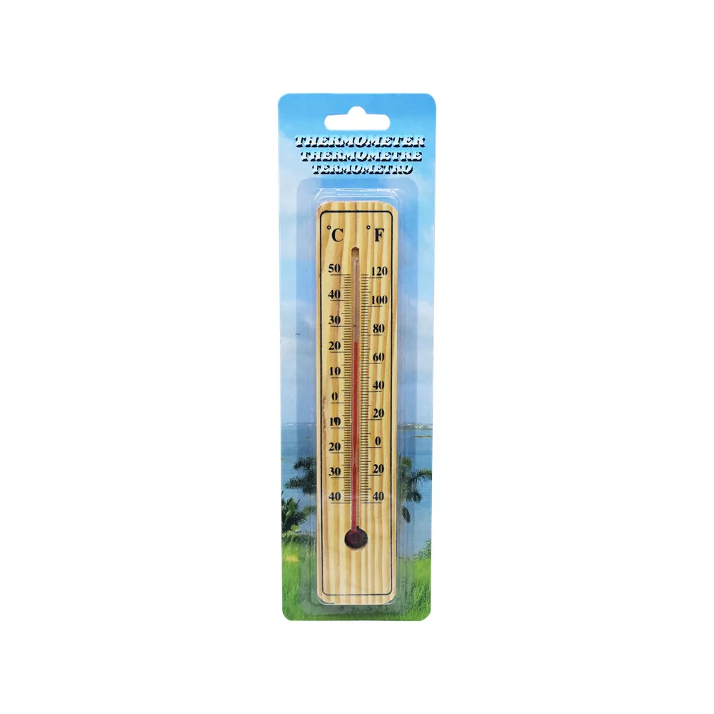 Fa hőmérő. Mérete: 5 x 22 cm. Méréshatár: +50°C és-40°C között Anyaga: fa, alkoholos folyadék Befoglaló méret (cm): 22×5×1 (Ho × Szé × Ma) Súly: 40g Szín: natúrKatalóguskód: 48039