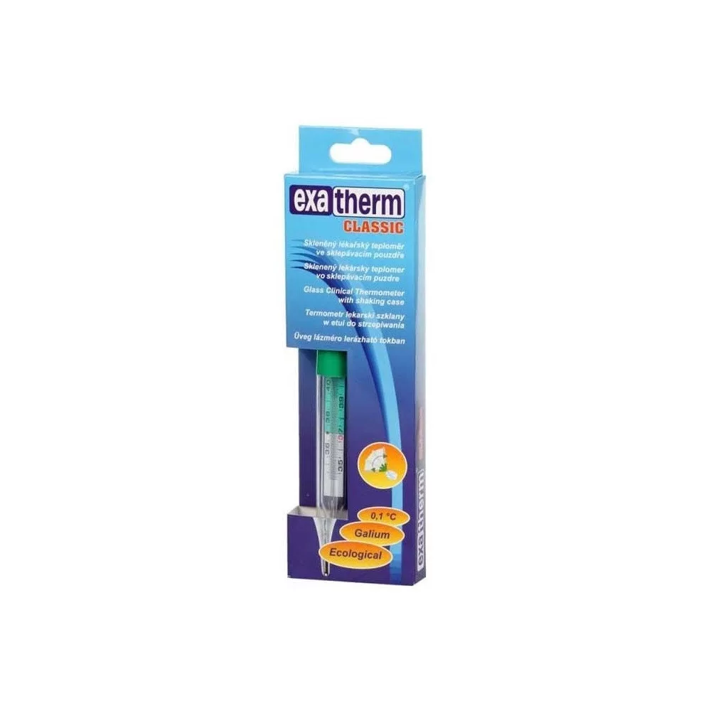 Exatherm Classic klinikai üveg lázmérő orvosi pontosságú, klasszikus klinikai üveg lázmérő, amely teljesen ártalmatlan higanymentes, környezetbarát mérőfolyadékkal van töltve.