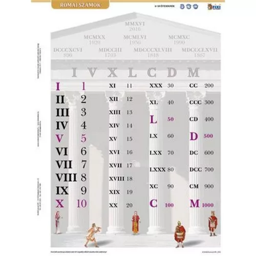 A római számokat gyakoroltató munkalap. Bármilyen kapcsos mappába lefűzhető, a többi tanulói munkalappal együtt gyűjthető, így válnak rendszerezhetővé, áttekinthetővé az alapismeretek. Előnye, hogy dupla oldalas: az egyik oldala tanít, a másik gyakoroltat. A tanuló önmagát is tudja ezáltal ellenőrizni. Mivel vízálló, írható- letörölhető a felülete, újra és újra használható.