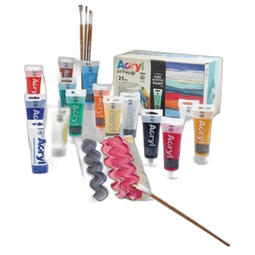 The PRIMO HOBBY & PROFESSIONAL acrylic paint set with 16 vibrant colors, 2 canvases and 5 brushes helps artists express their creativity and create the highest quality paintings.