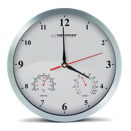 Ez az óra nem csak a pontos időt mutatja, hanem a szoba hőmérsékletét és a páratartalmat is. Rendkívül elegáns és stílusos kialakításának köszönhetően kiválóan alkalmas lakások, irodák, üzletek vagy éttermek díszítésére. A nagyméretű tárcsa megkönnyíti az idősebb emberek számára az idő leolvasását a szobában, bárhol. Átmérő: 30 cm Vastagság: 4cm Anyag: Alumínium keret Óra tárcsás lemez: art papír Tápegység: 1x AA elem (nem tartozék) Csendes mozgás - zökkenőmentes működés, Rendkívül pontos mechanikus mozgás: kvarc, Beágyazott akasztó az egyszerű telepítéshez, Mérések: hőmérséklet és páratartalom Mérési hőmérsékleti tartomány: -30 ° C ~ + 50 ° C, -30 ° F ~ 110 ° F Páratartalom mérési tartomány: 0 ~ 100% 1 év garancia Gyártó: Esperanza Szélesség cm: 31,6 Hosszúság cm: 4,6 Magasság cm: 31,5 Katalóguskód: 28503