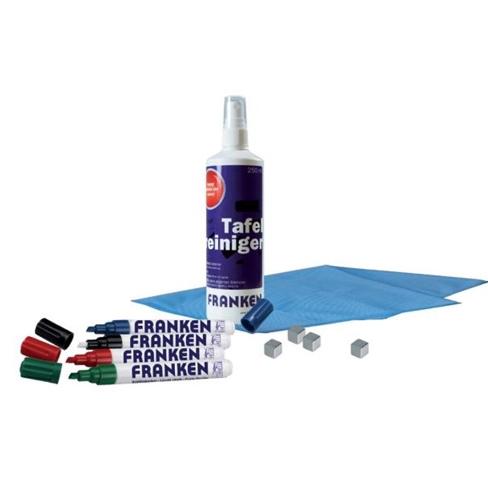 Indulókészlet üvegtáblához. 250 ml tisztító spray, 4 db üvegtábla marker(fekete, kék, piros, zöld), 4 db erős mágnes 10x10x10 mm, mikroszálas törlőkendő kék színben 40x40 cm. Katalóguskód: 30774