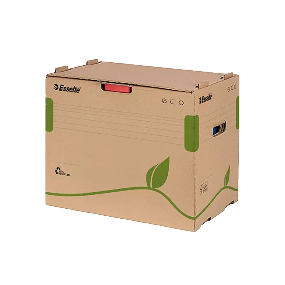 Az Eco dobozok költséghatékony és környezetbarát megoldást kínálnak a dokumentumok archiválásához - 100%-ban újrahasznosított (85%-ban kommunális hulladékból előállított) és 100%-ban újrahasznosítható karton alapanyag - FSC minősítés - konténer iratrendezők, gyűrűskönyvek archiválásához - az előre nyíló tető lehetővé teszi az iratrendezők elérését a konténer polcról történő leemelése nélkül is - 5 db 75 mm gerincű iratrendező számára - az azonos típusú dobozok egymásra helyezhetők, a doboz szélén található speciális fülek megakadályozzák a dobozok elmozdulását - a megerősített oldalfalak és talp stabil kialakítást eredményez és lehetővé teszi terjedelmesebb dokumentumok tárolását - könnyen összeállítható, összeállítási útmutató a dobozokon - méret: 427mm x 343mm x 305mm Katalóguskód: 35926