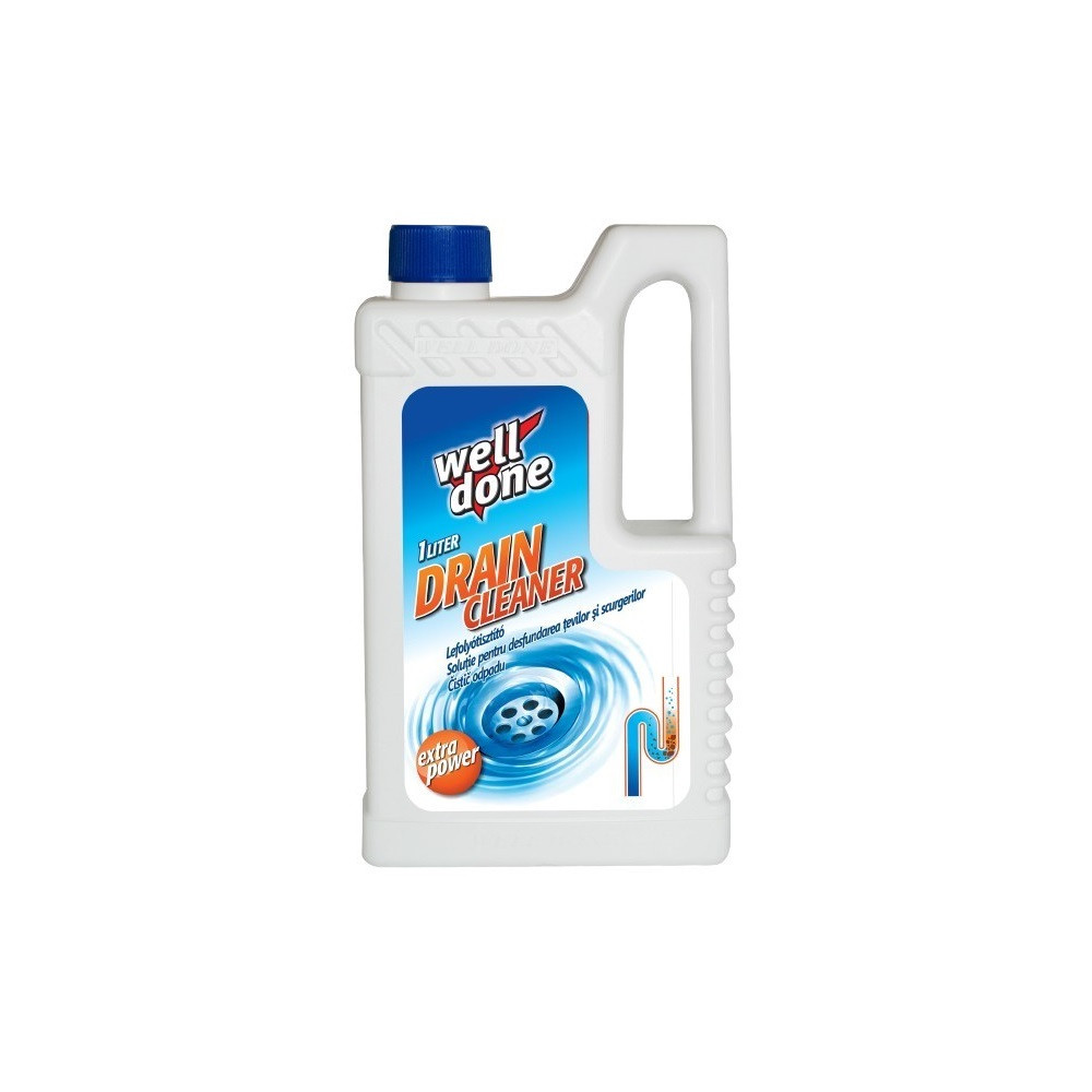 Well Done lefolyótisztító magas hatásfokú, koncentrált tisztítószer, mely eltávolítja a makacs lerakódásokat és a kellemetlen szagokat a lefolyócsövekből. A gél formátumnak köszönhetően keresztülfolyik a felgyűlt vízen is. Elpusztítja a baktériumokat és szagtalanít. Mindenfajta fém és műanyag lefolyócsőhöz alkalmas és biztonságosan használható. Elsősorban szerves eredetű dugulások elhárítására használhatja.