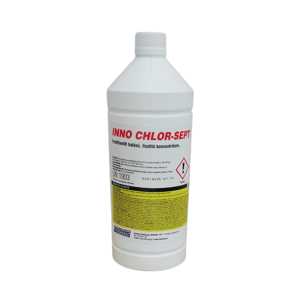 Fertőtlenítő hatású tisztítószer 1 liter klóros Inno Chlor-Sept termék alkalmazásakor ügyeljen a biztonságra! Használat előtt mindig olvassa el a címkét és a használati útmutatót!