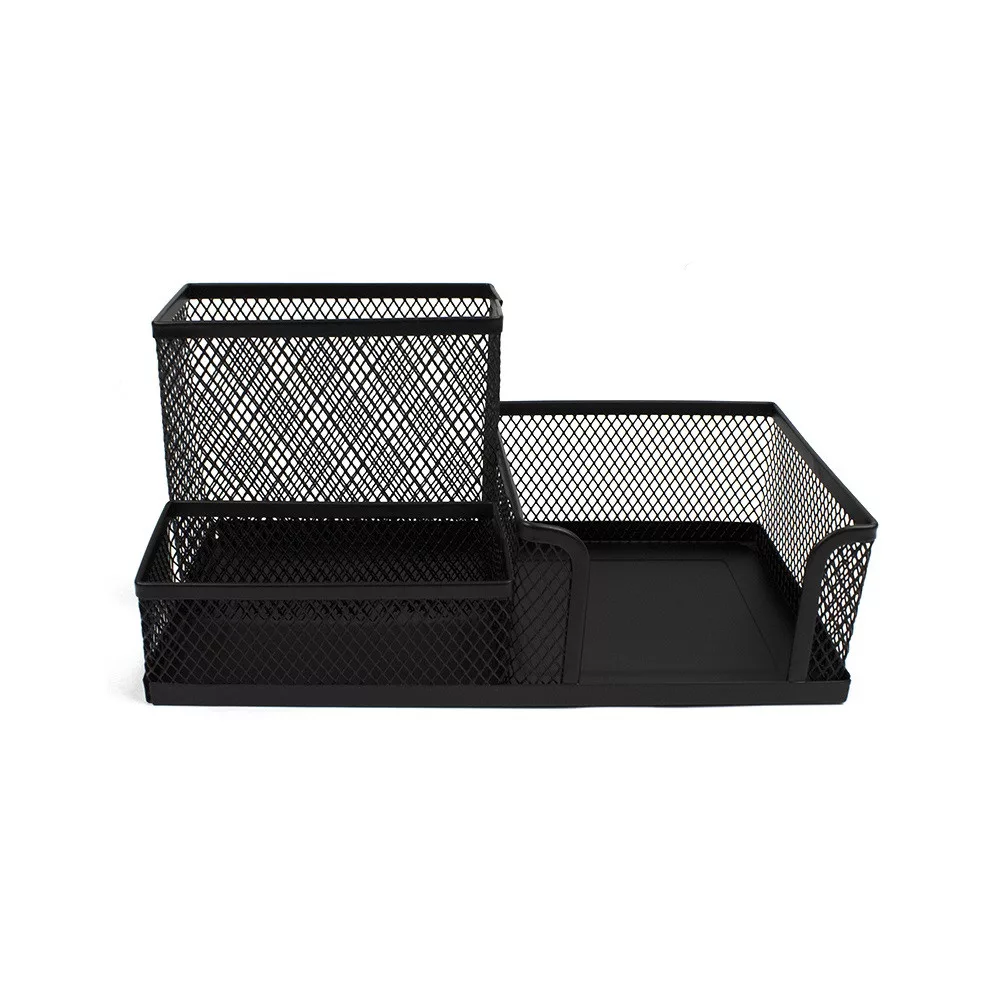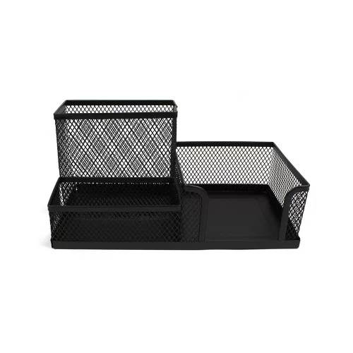 A csomag két íróeszköz-rekeszt és egy papírkockarekeszt foglal magában. A termék méretei talppal együtt 20,3 cm hosszú, 10,3 cm széles, és 9,3 cm magas. Ez az írószertartó tökéletes az asztalon való rendszerezéshez, hogy könnyen elérhetők legyenek az íróeszközök és jegyzettömbök.