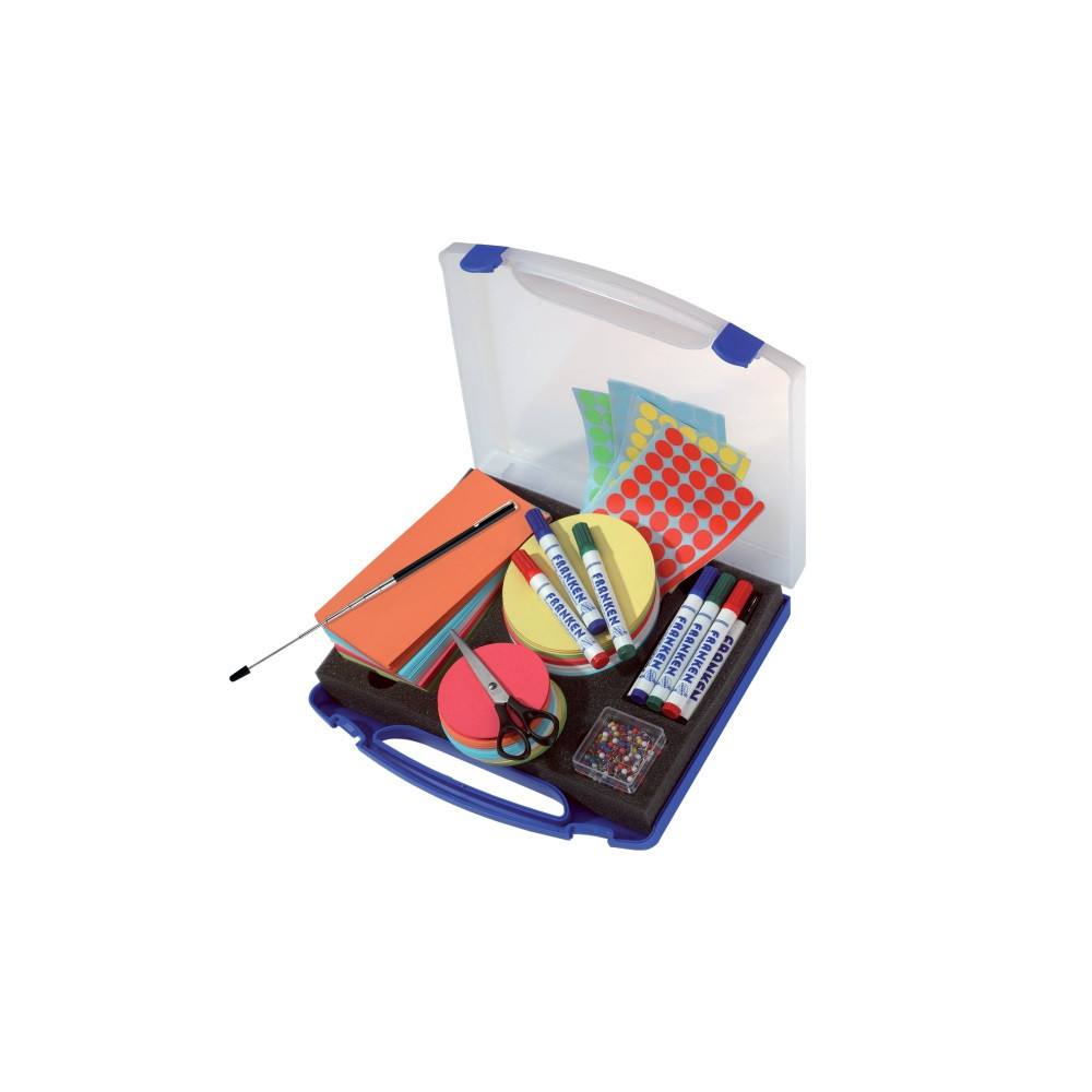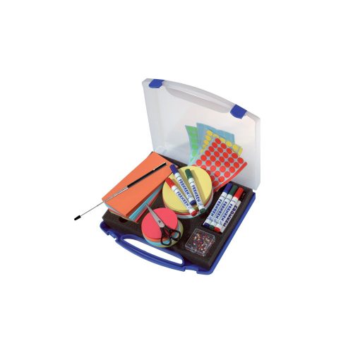 Műanyag bőrönd kék fedél, átlátszó, súlya tartozékokkal kb. 1,5 kg, tartalom: 150 db. bemutató körök ? 9,5 cm, 6 színben válogatott 150 db. bemutató körök ? 14 cm, 6 színben válogatott 150 db. téglalapok 9,5 x 20,5 cm, 6 színben 480 jelölőpont (120x piros, zöld, sárga, kék) 10 flipchart jelölő (4x fekete, 2x piros, 2x zöld, 2x kék) 1 db lézermutató integrált golyóstoll 3 elemmel 1 olló 200 db jelzőtüske kerek fejjel, különböző színekben Méret SZxMxM: 34,5 x 6,0 x 31,0 cm.