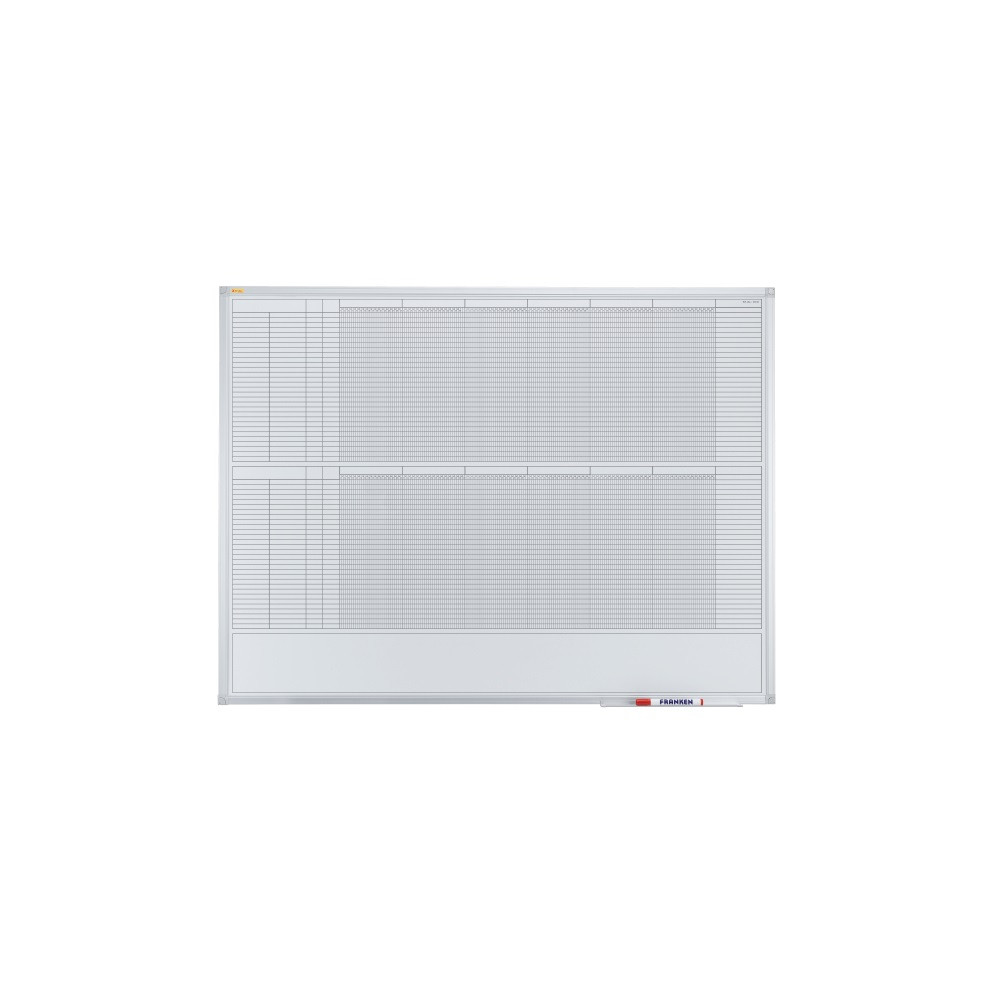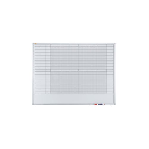 A tervezőtáblák környezetbarátak, mivel minden évben újrafelhasználhatók. Mágneses írófelület ezüst eloxált alumínium kerettel. Tartalmazza a tárolótálcát és a rögzítőanyagokat (tükörtartó, csavarok és tiplik). Éves tervezés 12 hónapra 30 pozícióval és egy extra jegyzetmezővel. Napi mező: 4 x 10 mm, indexmező: 171 x 10 mm. Méretek (Sz x M): 120 x 90 cm.