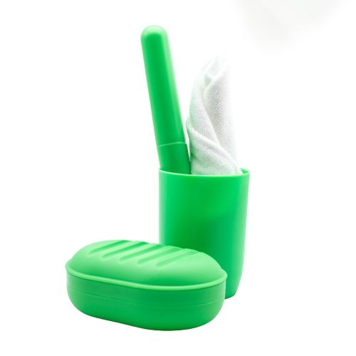 Tisztasági csomag összehúzható, zsinóros átlátszó zsákban. Tartalma: műanyag pohár, szappantartó, fogkefetartó, kéztörlő.