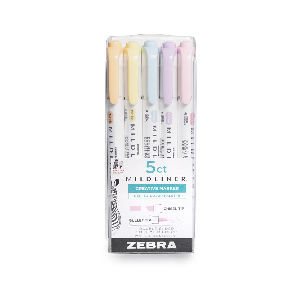 Szövegkiemelő készlet, 1,4/4 mm, kétvégű, Zebra Mildliner Highlighter Gentle, 5 különböző szín