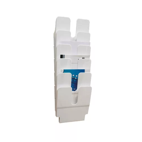 A FLEXIPLUS egy modern formát kölcsönző prospektustartó, 6 rekesszel, A4-es álló formátumú tájékoztatókhoz. A 6 rekesz 1 darabos prospektustartóként is lehet alkalmazni. Töltési kapacitás 23 mm, kb. 6 kg a teherbírása a 6 rekszenek együtt. Katalóguskód: 24824
