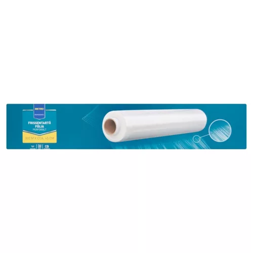 Perforált frissentartó fólia speciális, párásodásmentes polietilén alapanyagból, mindkét irányban nagy mértékben nyújtható, rendkívül erős és kiváló tapadással rendelkezik, 45 cm-ként perforáció könnyíti meg a tépést, gazdaságos felhasználást.